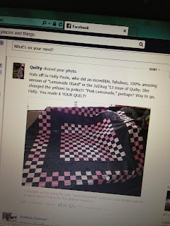 I decided to post my pink & black checkers quilt on Quilty magazine's facebook page, since that's where I found the pattern. I used their "lemonade stand" pattern from the July/Aug 2013 issue of {simple summer projects}. I didn't think anything would really come of it, but I like to share the work that I have done with the people/thing that had inspired me to do it.